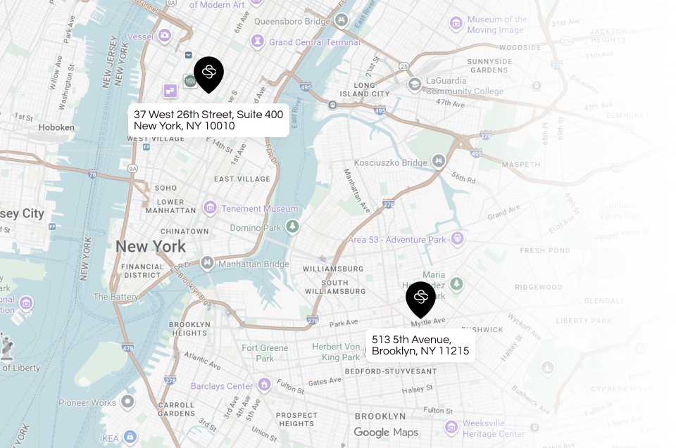 We have two locations: one in Manhattan at 37 W 26th St, Suite 400, New York, NY 10016, and another in Brooklyn (513 5th Avenue). Both offer a welcoming atmosphere with expert care. Check our website for exact Brooklyn address details and operating hours.